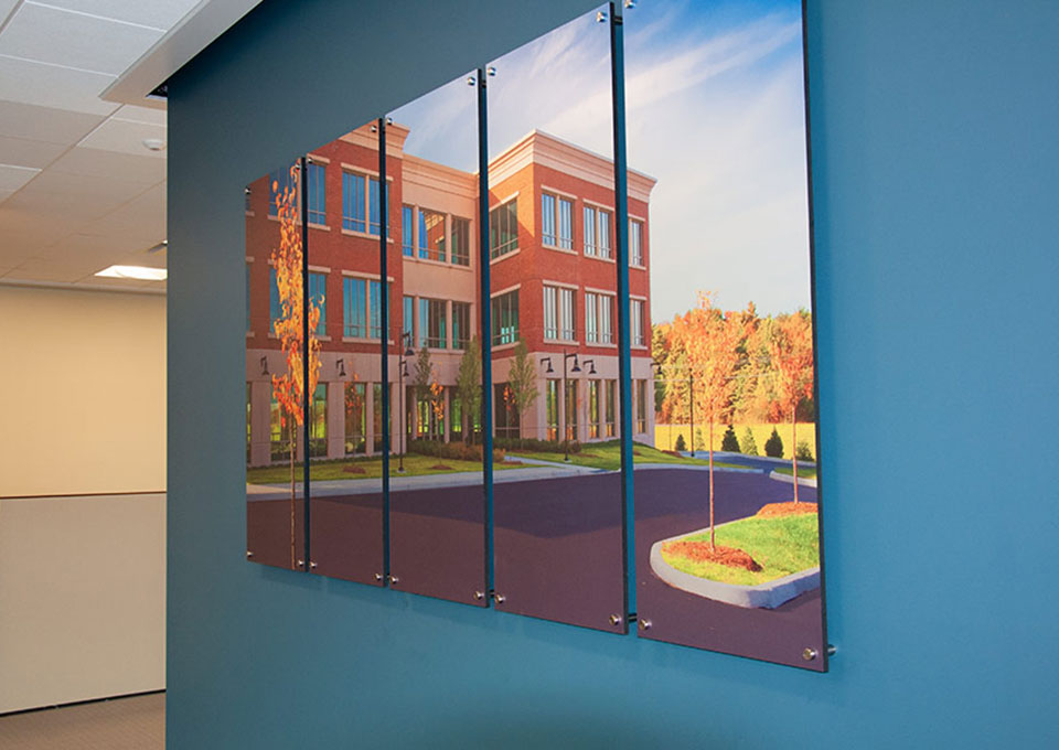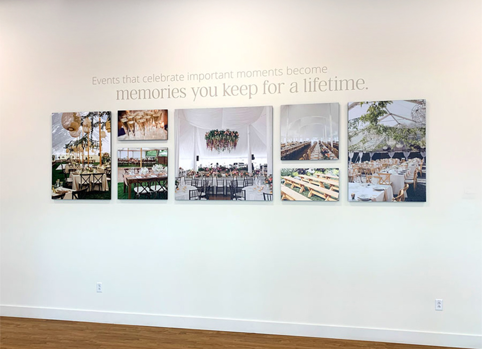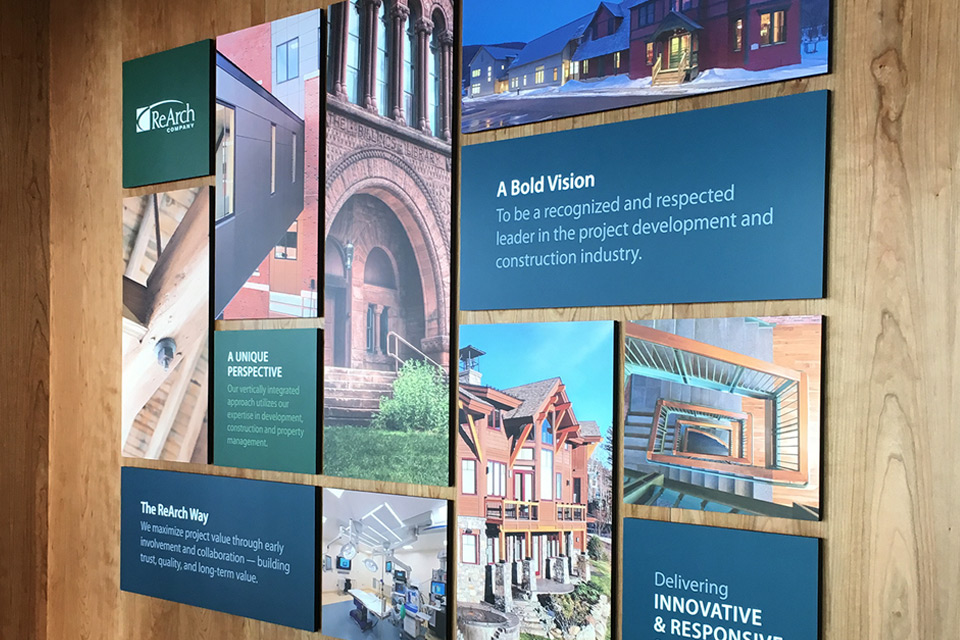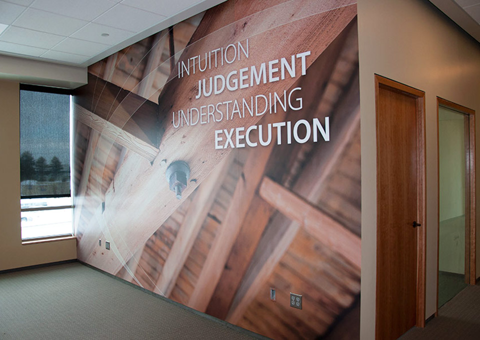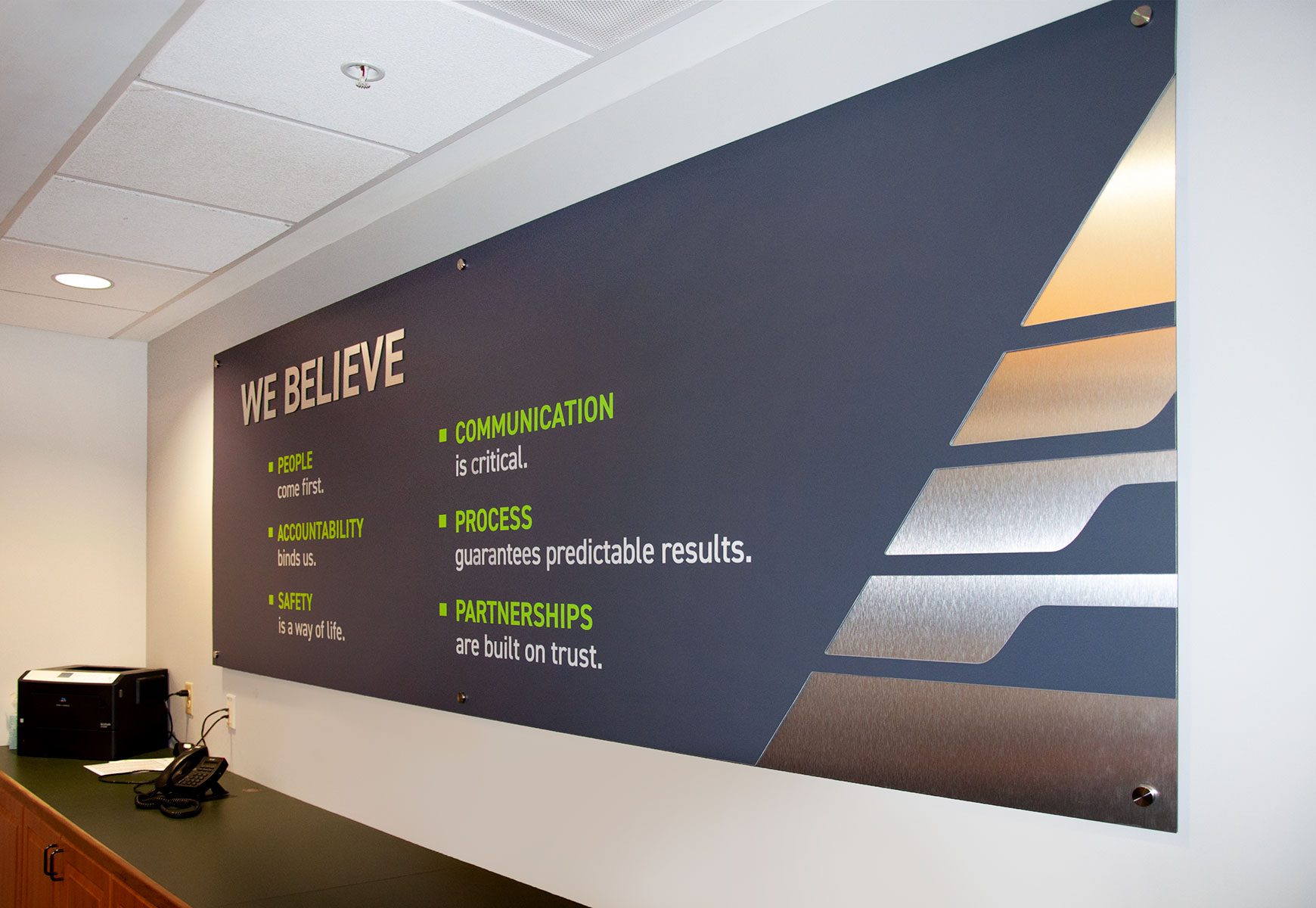 Bring your brand inside! Environmental design, or interior branding, can enliven your space, lift your credibility, and inspire everyone who walks through your door. We work closely with our clients to add branding, messaging, and graphic design to their spaces in a variety of forms such as wall murals, custom metal signage, large-scale messaging, designs on glass, graphic displays, framed prints, and photo collages.